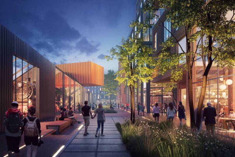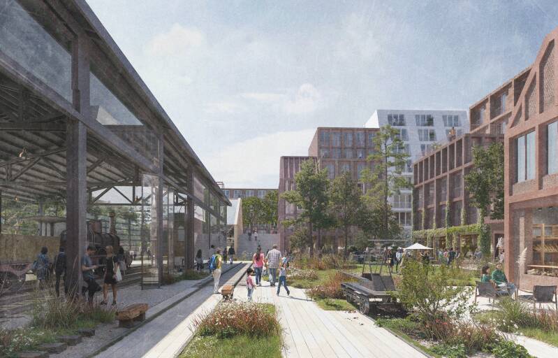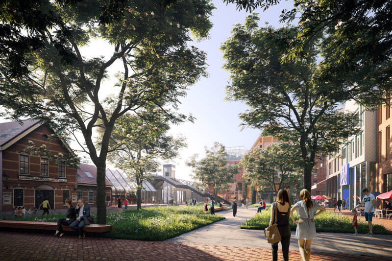 Een sfeerimpressie van de stoomtrampromenade met rechts voorzieningen en woningen. © De Nieuwe Golf.